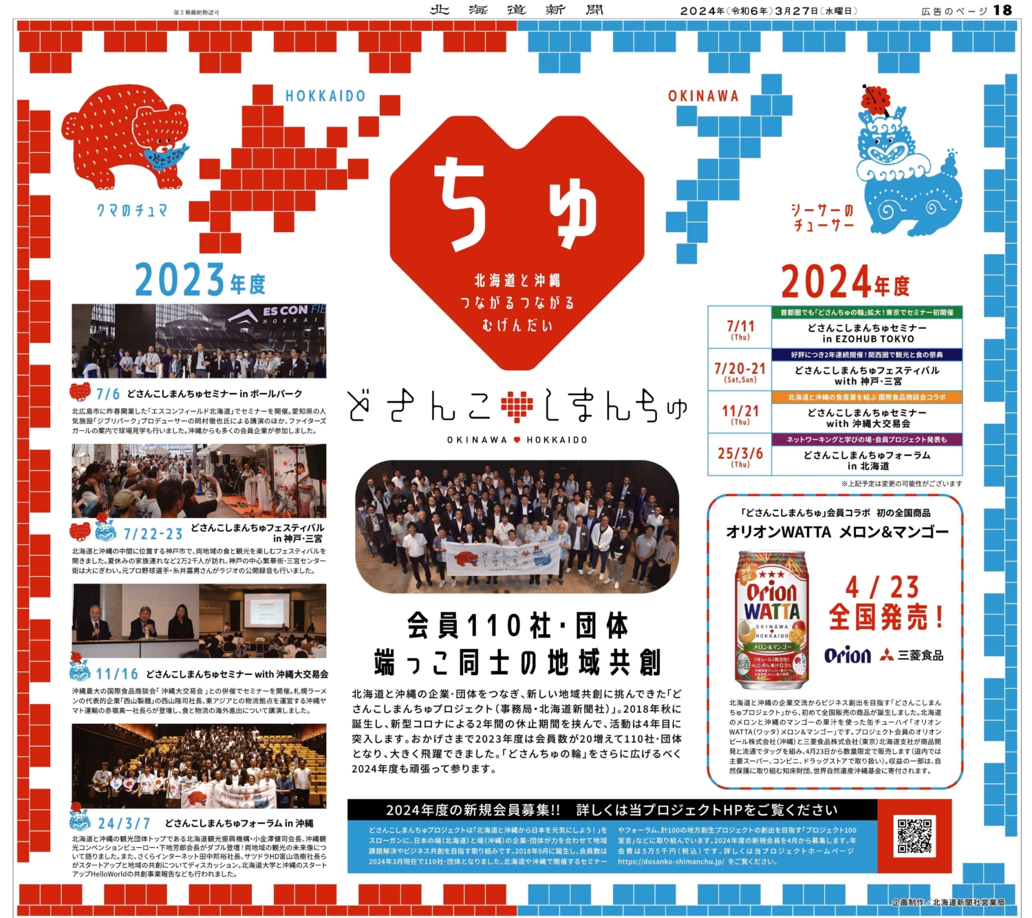 北海道と沖縄の企業・団体をつなぎ、新しい地域共創に挑んできた「どさんこしまんちゅプロジェクト(事務局・北海道新聞社)」。2018年秋に誕生し、新型コロナによる2年間の休止期間を挟んで、活動は4年目に突入します。おかげさまで2023年度は会員数が20増えて110社・団体となり、大きく飛躍できました。「どさんちゅの輪」をさらに広げるべく2024年度も頑張って参ります。